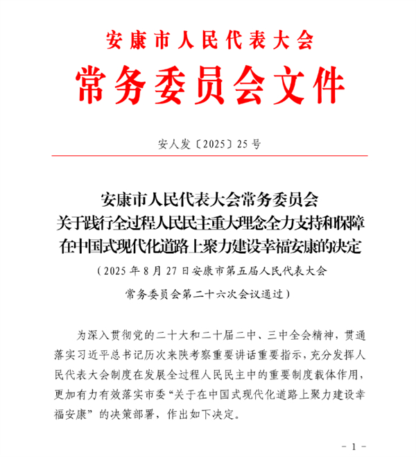 本網(wǎng)訊(通訊員 周清華 張凡)8月27日,安康市五屆人大常委會第二十六次會議作出《安康市人民代表大會常務(wù)委員會關(guān)于踐行全過程人民民主重大理念全力支持和保障在中國式現(xiàn)代化道路上聚力建設(shè)幸福安康的決定》(以下簡稱《決定》),并自印發(fā)之日起實施。以地方人大常委會作出重大事項決定的形式,將黨的主張通過法定程序轉(zhuǎn)化為全體人民的共同意愿,是安康市人大常委會強(qiáng)化擔(dān)當(dāng)、依法履職的創(chuàng)新實踐,是圍繞中心、服務(wù)大局的務(wù)實舉措,必將為在中國式現(xiàn)代化道路上聚力建設(shè)幸福安康注入堅實的人大力量。
