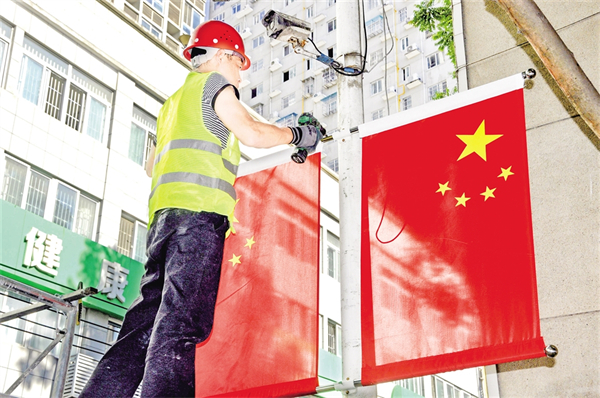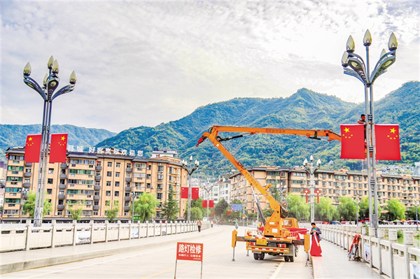 9月25日,紫陽縣城區(qū)橋溝路的大道上,工人正在懸掛國旗。