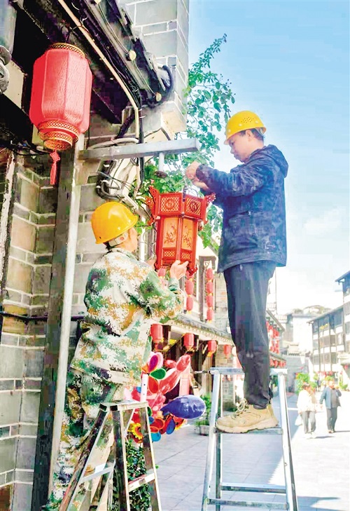 9月24日,石泉縣積極籌備國慶黃金周旅游服務(wù)保障工作。圖為石泉縣漢江古城景區(qū),工作人員正在更換景觀燈。