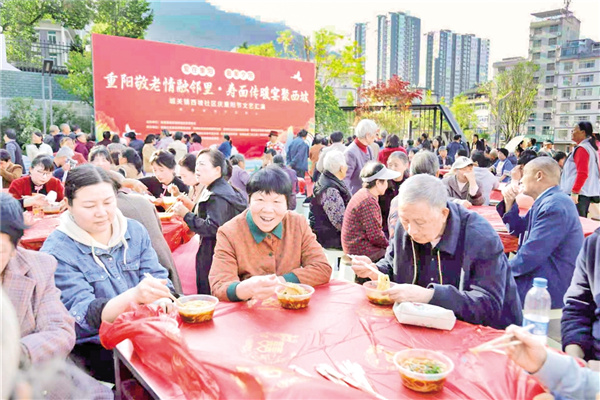 10月28日,嵐皋縣城關(guān)鎮(zhèn)西坡社區(qū)舉辦了“重陽敬老情融鄰里·壽面?zhèn)髋缇畚髌?rdquo;主題活動。廖霖 攝