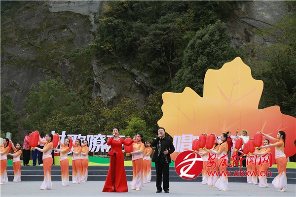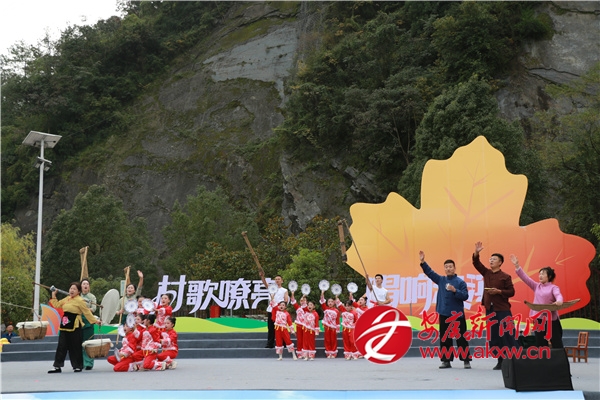 金秋時節(jié)的茨溝鎮(zhèn),萬畝紅葉、層林盡染。伴隨著歡快的鑼鼓聲,茨溝鎮(zhèn)、五里鎮(zhèn)、譚壩鎮(zhèn)三支隊伍輪番登場,不僅獻唱原創(chuàng)村歌,還展示特色產業(yè)、優(yōu)質資源與地方文化,紛紛亮出獨具特色的“看家絕活兒”。歌伴舞《村歌飛揚》《松壩謠》《幸福歌兒唱起來》唱出了鄉(xiāng)親們的幸福生活;以修建八一水庫為背景的安康歌謠《我來了》引發(fā)會場共鳴;民俗表演《龍的傳人》則將節(jié)目推向高潮。舞蹈、鄉(xiāng)村T臺秀、民俗表演、八岔戲等節(jié)目,或以傳統(tǒng)幽默詼諧的風格,或以深情敘述的方式,展現(xiàn)鄉(xiāng)村新生活,為觀眾獻上一場別開生面的視聽盛宴,現(xiàn)場歡呼聲此起彼伏。
