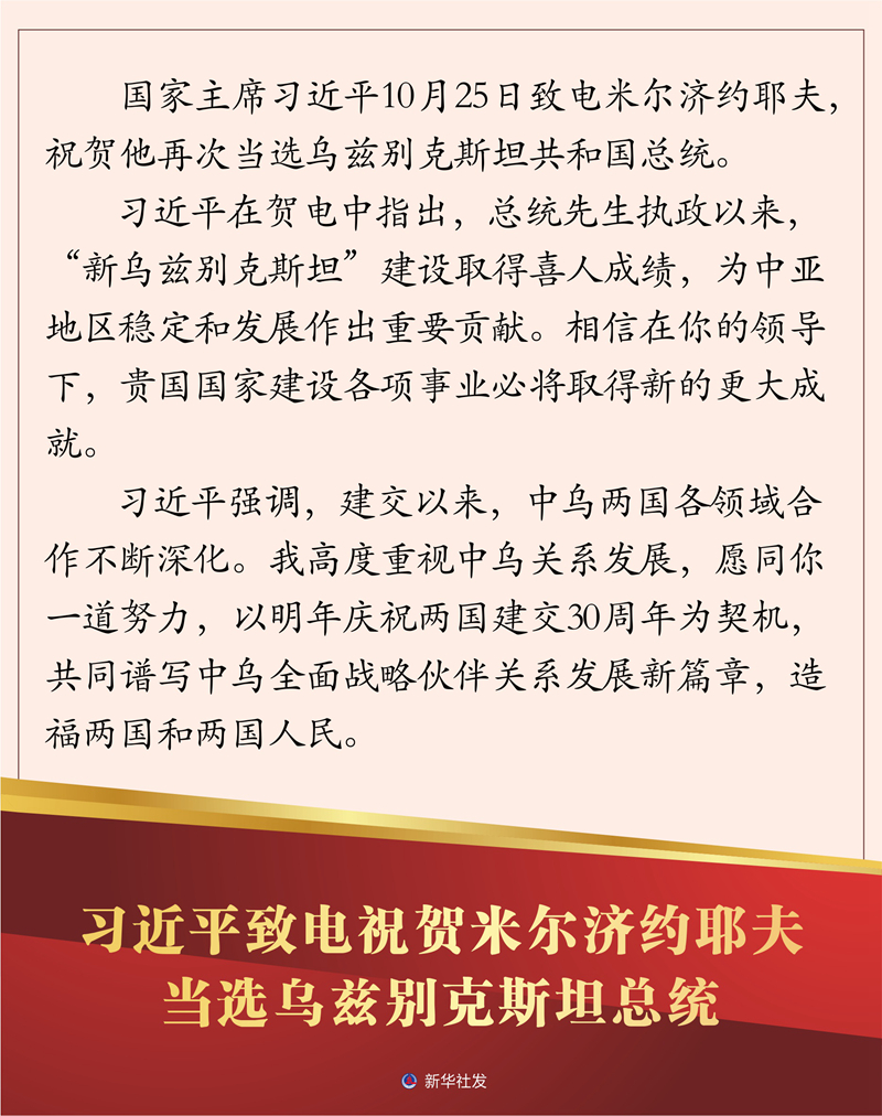 新華社北京10月26日電 國家主席習(xí)近平10月25日致電米爾濟(jì)約耶夫,祝賀他再次當(dāng)選烏茲別克斯坦共和國總統(tǒng)。TVv安康新聞網(wǎng)