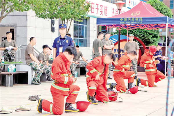 “開始!”裁判一聲令下,參賽隊員們?nèi)珉x弦之箭,迅速在原地依次穿戴全套防護裝備。